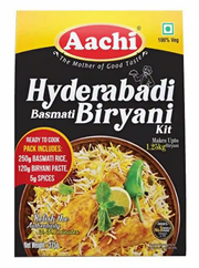 - AACHI Hyderabadi Basmati Biryani Kit 365 g is a complete meal kit featuring premium basmati rice (~250 g), Hyderabadi biryani masala paste (~110 g), and a packet of whole spices (~5 g). It’s vegetarian-friendly, gluten-free, and contains no added preservatives.